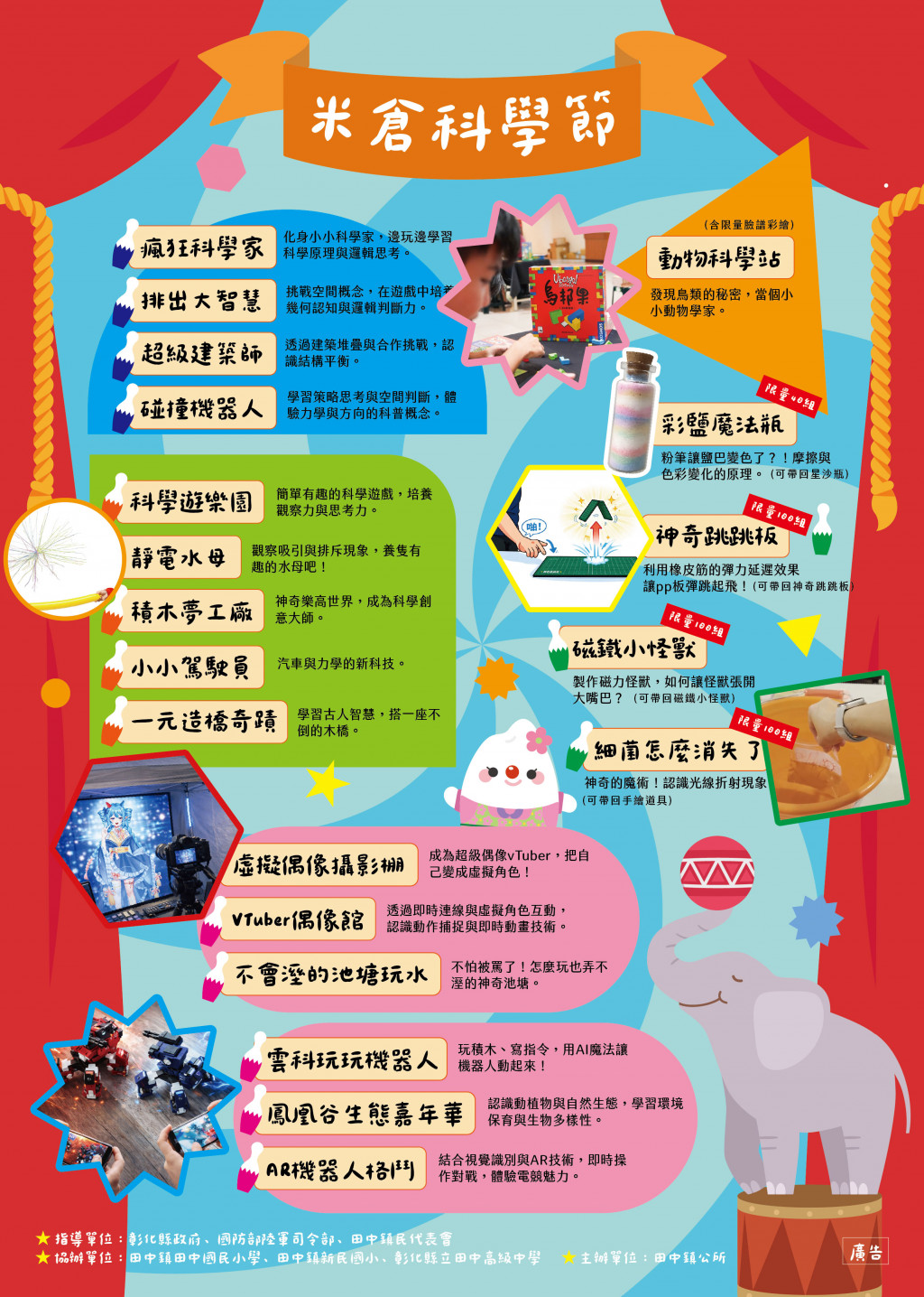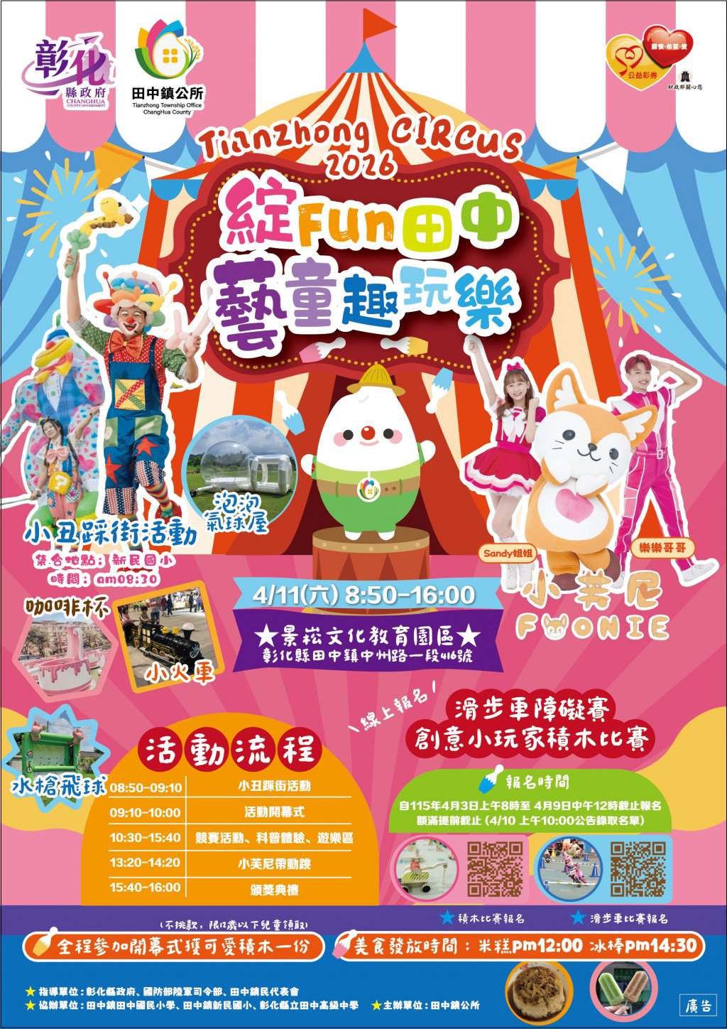 田中鎮環境保護宣導暨慶祝兒童節活動,擬於115年4月11日(星期六)上午9時假彰化縣立景崧文化教育園區擴大舉行,活動內容包括大型小丑踩街、小芙妮表演、滑步車運動、積木比賽及科普攤位探索等。